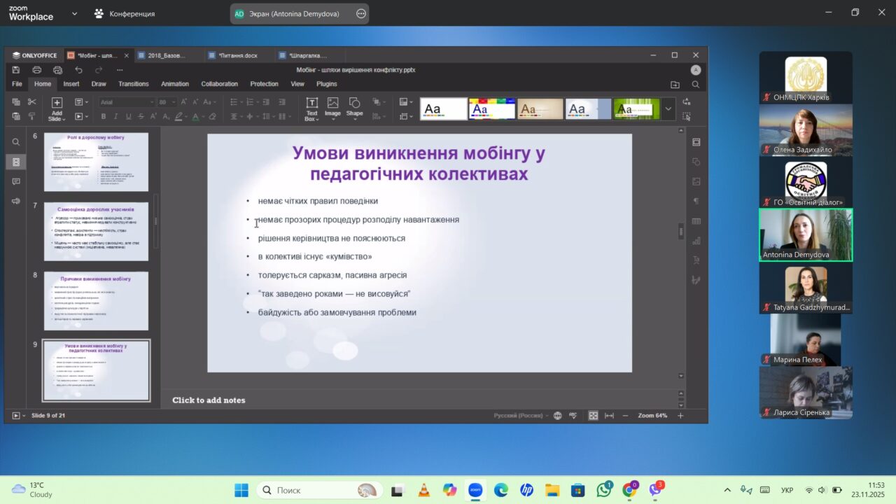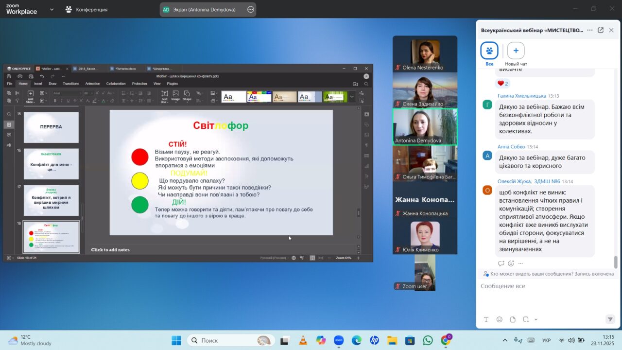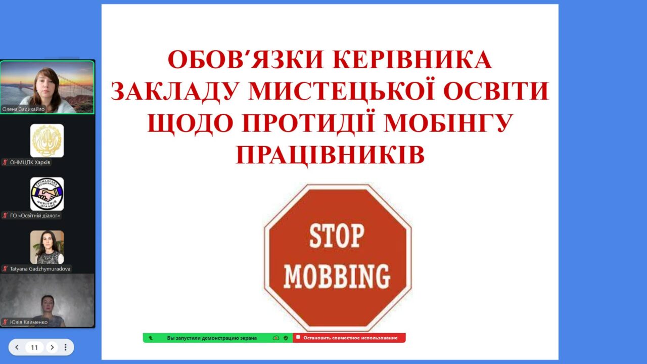 Присутні на вебінарі активно долучилися до аналізу реальних ситуацій, ставили запитання й обговорювали виклики, з якими сьогодні стикаються мистецькі школи, зокрема: які юридичні наслідки можуть мати дії (або бездіяльність) адміністрації у випадку виявлення фактів мобінгу; як підтримати сприятливий психологічний клімат, не втрачаючи довіри й авторитету в колективі.