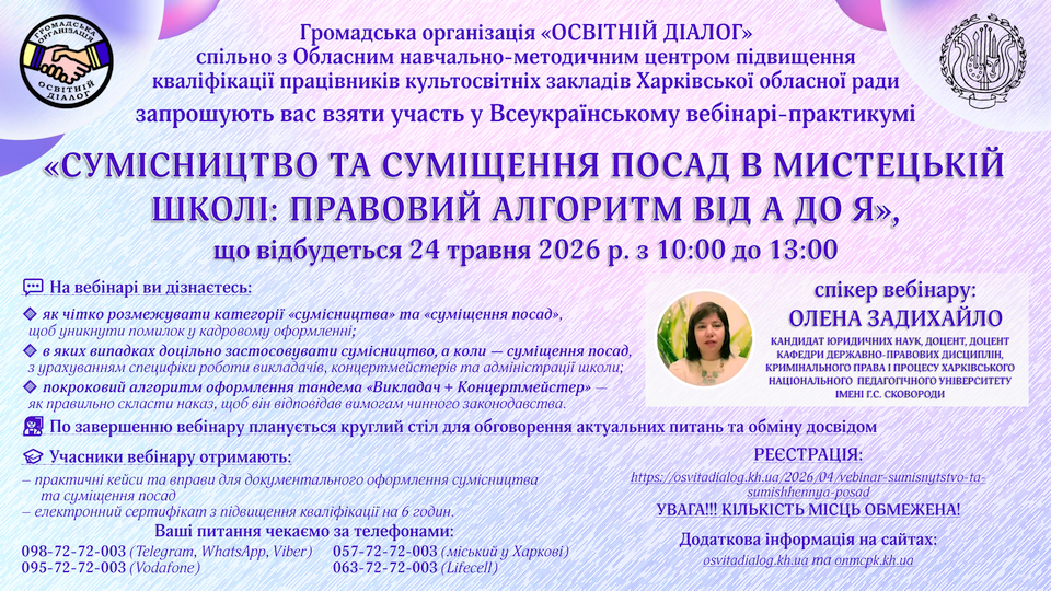 Вебінар «Сумісництво та суміщення посад в мистецькій школі: правовий алгоритм від А до Я»