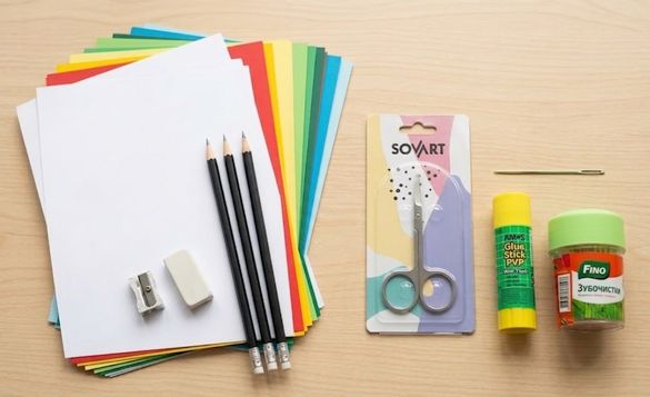 папір кольоровий та білий, картон кольоровий формату A4, ножиці маленькі з загостреними кінчиками, олівець простий, гумка, клей олівець, зубочистка або голочка «циганка».